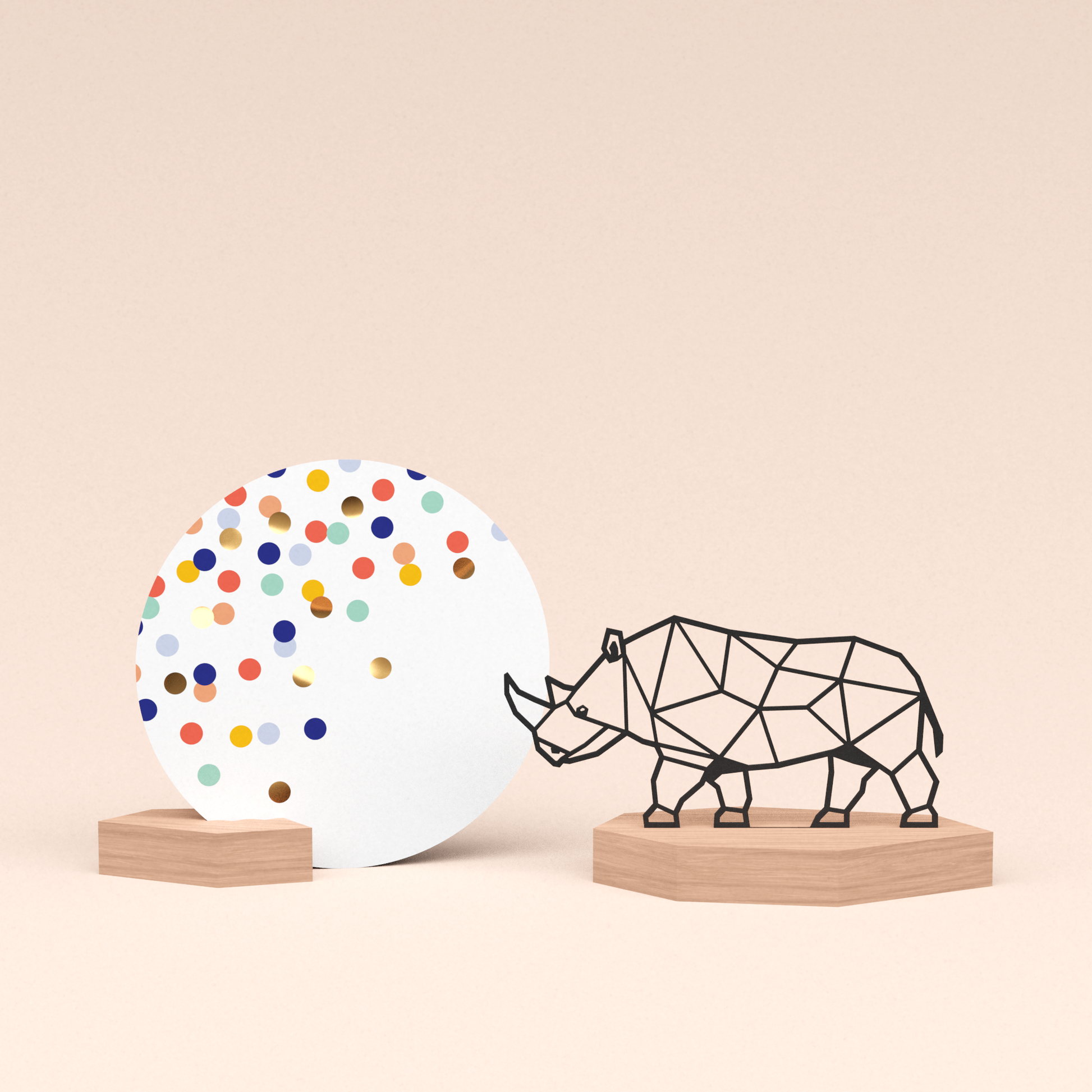 De polygone illustraties lasersnijden we zelf, uit duurzaam matzwart karton, de wenskaarten laten we drukken in Nederland en de blokjes worden lokaal gemaakt van natuurlijk kersenhout. Ook de berichten op de kaarten schrijven we persoonlijk voor jullie – met onze schrijfrobot Niko - voorzien van onze zelfontwikkelde software en een eigen handschrift.